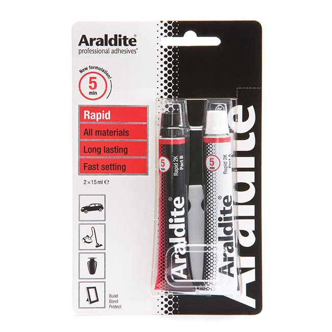 Solvent-free, 2-part, epoxy adhesive. Strong, rapid-setting and long lasting. Can be painted and sanded. Bonds metal, wood, masonry, ceramics, glass, dry concrete, chipboard, leather, cardboard, fabric, rubber and most hard plastics.